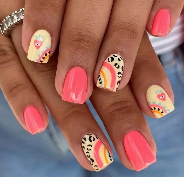 Set de 24 Uñas Postizas Brillantes - Diseños de Leopardo Dulce y Fresco, Corazón y Ojo para Mujeres y Niñas - Forma Cuadrada Corta, Colores Mixtos